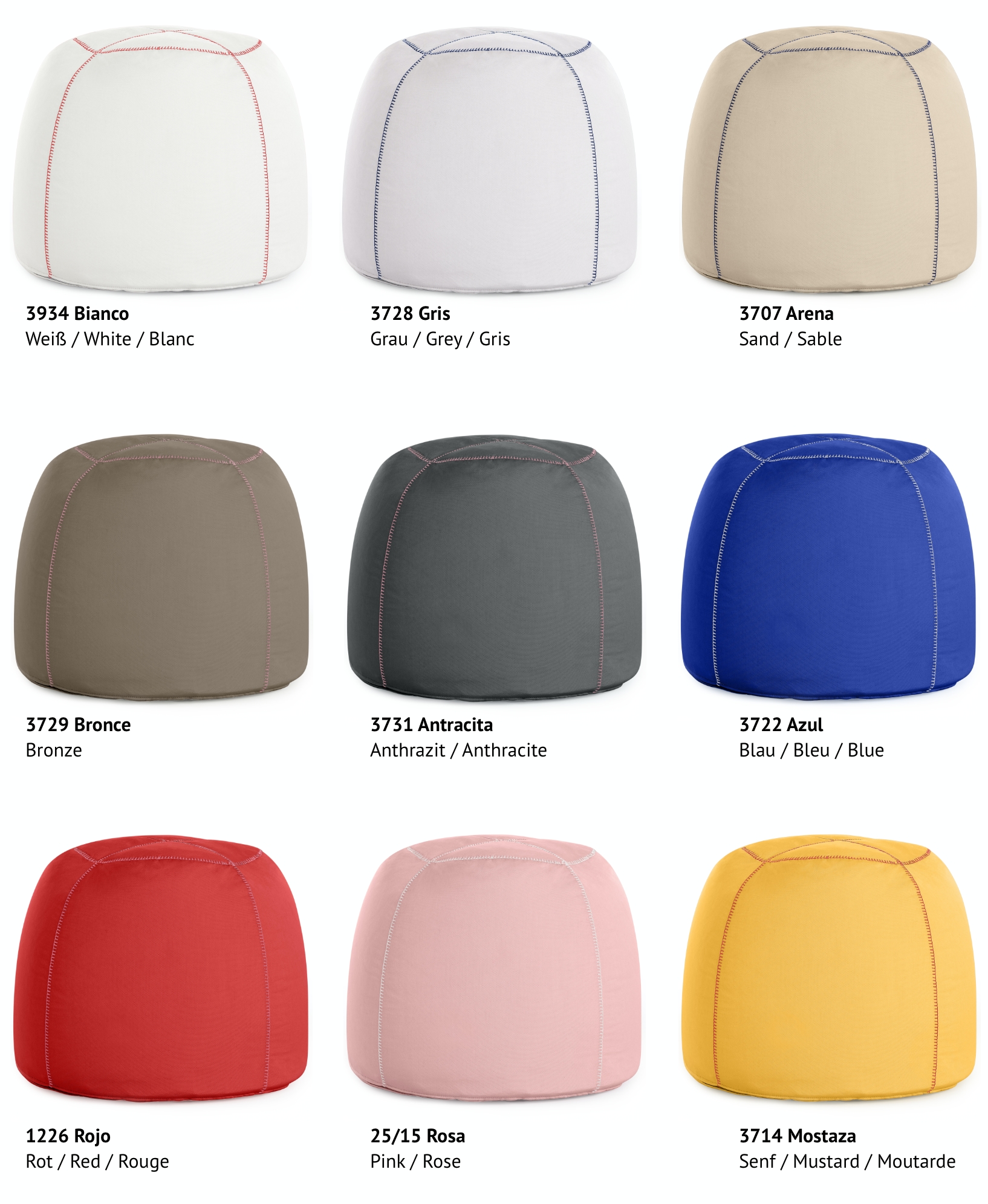 Seine Schöpferin Teresa Sapey macht die Nähte zum Erkennungsmerkmal dieses Poufs. "Ohne die Einfachheit und Vielseitigkeit des Produkts zu verlieren, haben wir uns dafür entschieden, die wesentlichen Elemente, die oft versteckt sind, neu zu erfinden und sie stärker hervorzuheben. Deshalb sind die Nähte so wichtig!".