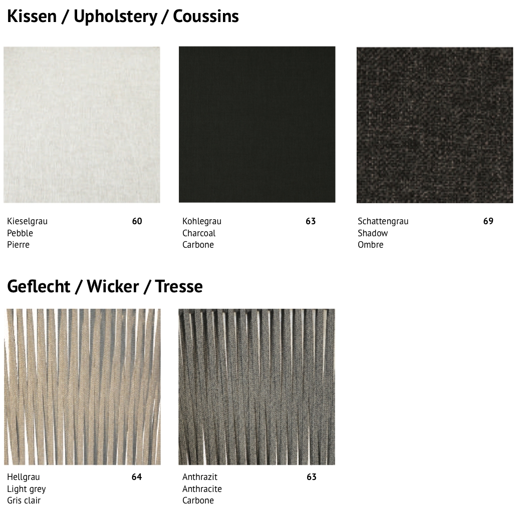 Die Bänder sind aus wetterfesten, und UV-beständigen Fasern. Die Outdoorkissen bestehen aus einem robusten Bezug mit Reißverschluss und einer Füllung mit Quick Dry Foam.
