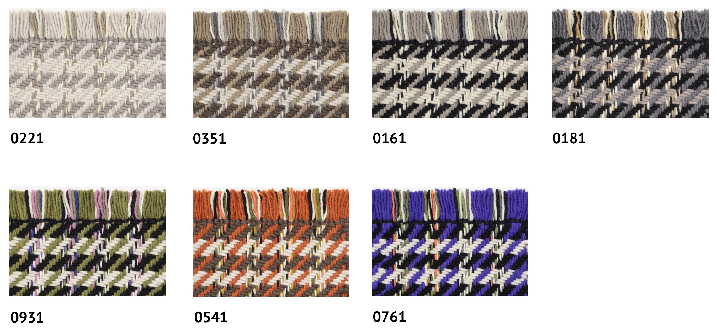 Der flachgewebte Teppich Dashes greift das klassische zweifarbige Hahnentrittmuster auf und abstrahiert es zu einer mehrfarbigen, mehrdimensionalen Grafik. Es ist ein auffälliges Design in Köperbindung, bei dem gewalkte Garne in Kette und Schuss verwendet werden.
