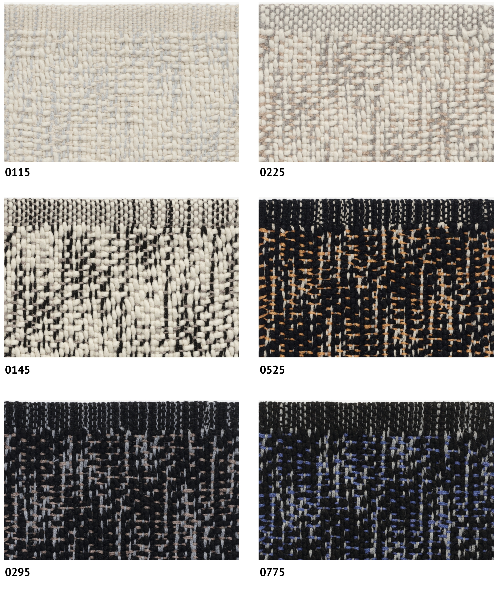 Sowohl Kette als auch Schuss bestehen aus Bündeln von drei feinen neuseeländischen Wollzwirnen, die sich mit gröberen, gefilzten neuseeländischen Wollgarnen abwechseln und dabei eine taktile und optisch ansprechende Struktur bilden.