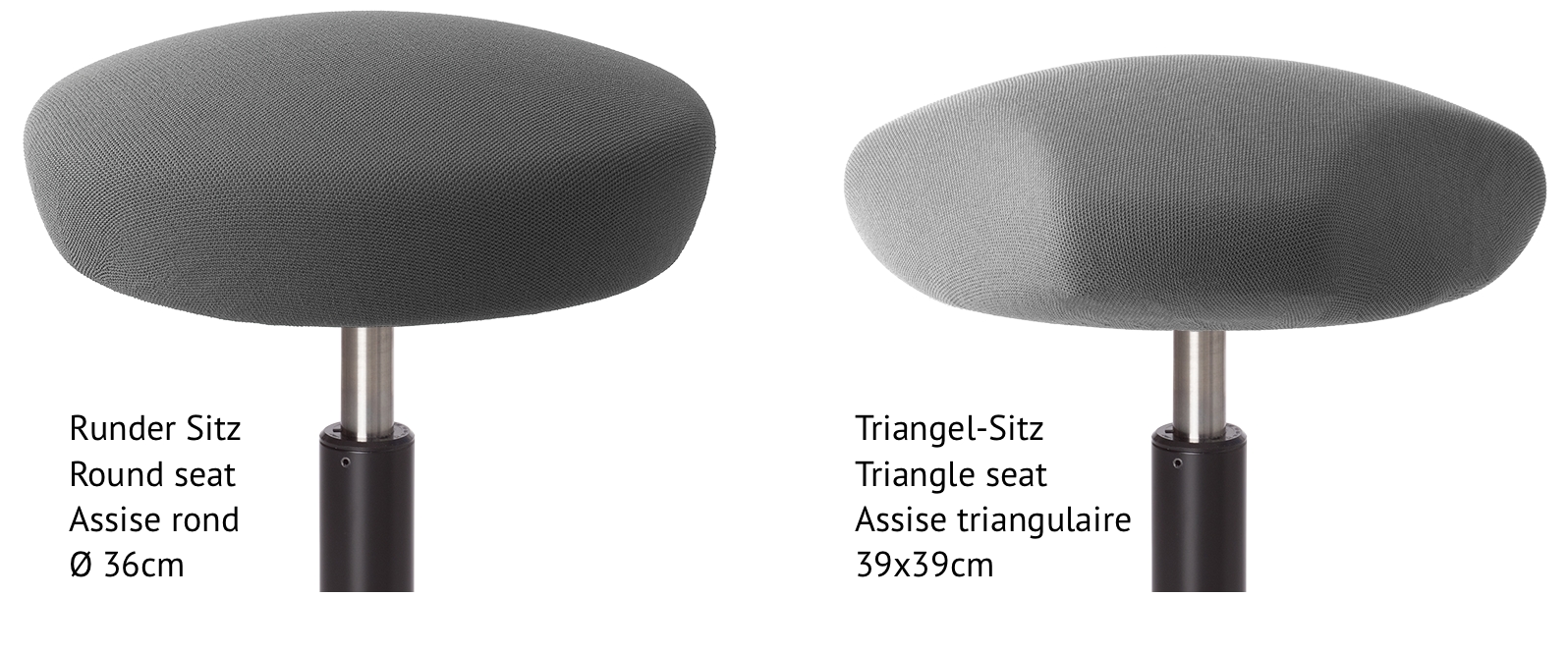 - Sitz: Triangel (39 x 39 cm) oder rund (Ø 36 cm)