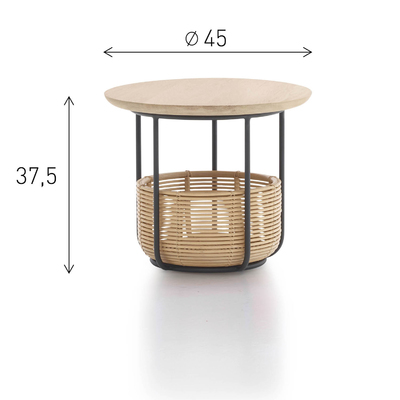 Praktischer Beistelltisch mit verzinktem und schwarz pulverbeschichtetem Stahluntergestell. Die Tischplatte besteht aus natufarbener Eiche und der Korb wird aus Rattan gefertigt. Der Beistelltisch ist in zwei unterschiedlichen Höhen erhältlich.