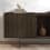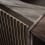 Die Schrankfronten aus geriffeltem, eloxiertem Aluminium bilden einen taktilen Kontrast zum geschnitzten Eichenrahmen und dem Marmoreinsatz in Pietra Grey oder Sky Grey, der den Schrank krönt. Die Eichenstruktur ruht auf spindelförmigen Metallbeinen, die einem Schrank, der ein hohes Gewicht tragen kann, einen leichten Ausdruck verleihen.