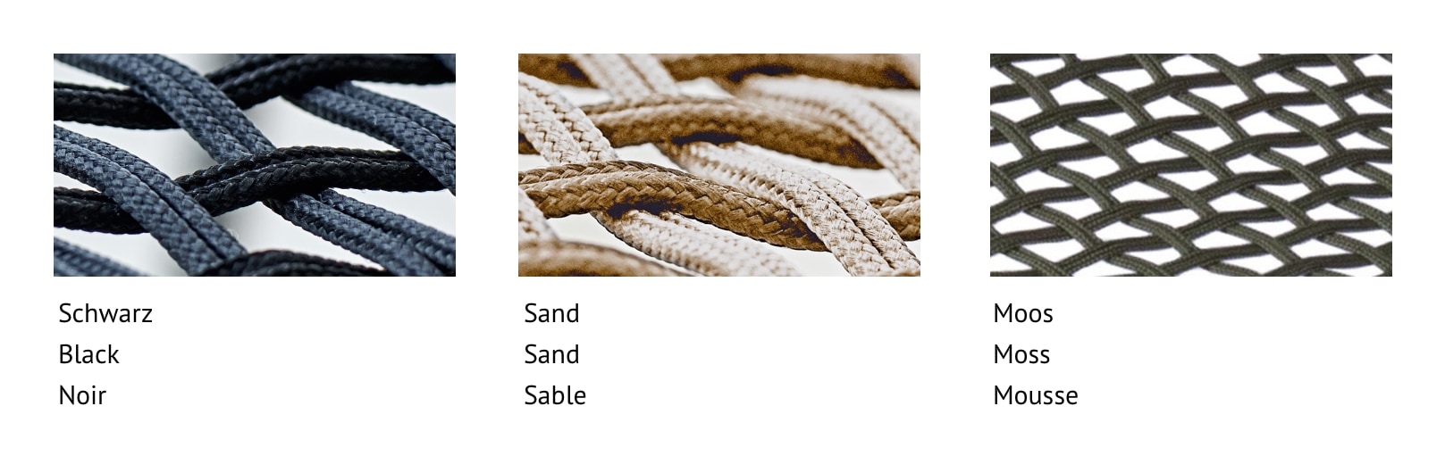 Stuhl, Sessel und Lounge Chair lassen sich stapeln, der Barhocker macht in der Küche wie auf der Terrasse eine gute Figur. Das Gestell aus glasperlengestrahltem oder schwarz pulverbeschichtetem Edelstahl trägt ein Geflecht aus pflegeleichtem Polyestergewebe. Passend dazu bieten wir verschiedene Tische an.