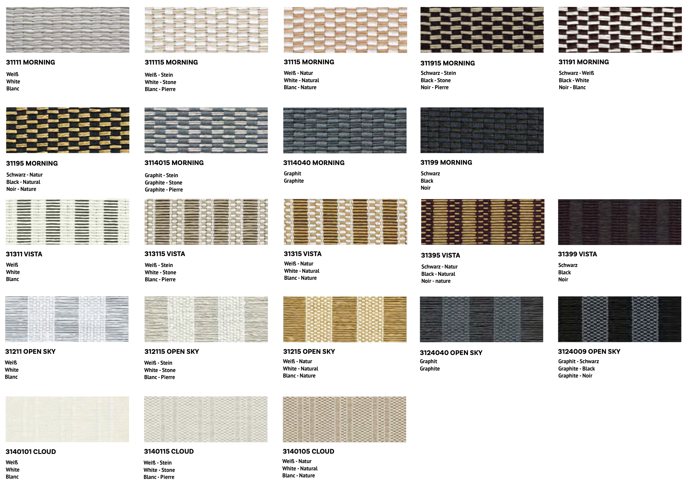 Das Material ist schmutzabweisend behandelt. Es stehen verschiedene Designs in unterschiedlichen Farben zur Verfügung: Morning, Open Sky, Vista und Cloud. Die Grundfarben sind Natur, Schwarz, Weiß, Graphit und Stein.